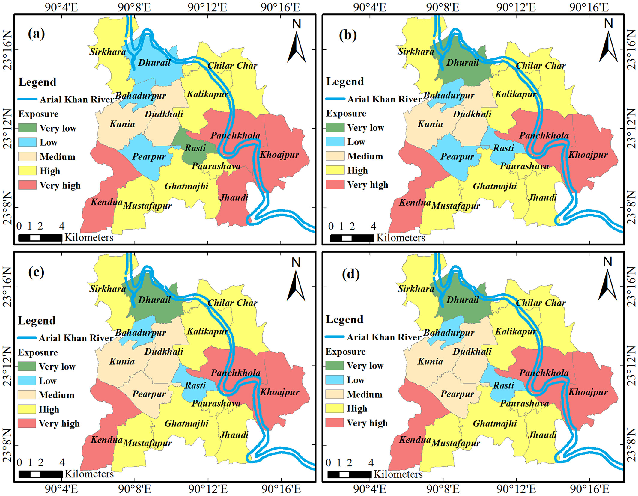 Integrated assessment of flood risk in Arial Khan floodplain of Bangladesh under changing climate and socioeconomic conditionsMd Sadiul Alam Chyon, Subir Biswas, M. Shahjahan Mondal, Binata Roy, and Afeefa RahmanJournal of Flood Risk ManagementIn the assessment of flood risk, the future flood hazard due to climate change is often tied to the present socioeconomic conditions. This makes an implicit assumption that the drivers of risk, other than the hazard, remain constant with time. Therefore, such risk assessment does not provide a realistic outlook for devising plausible mitigation strategies and plans. In this study, flood risk was assessed from an integrated perspective by considering both physical hazard, and socioeconomic exposure and vulnerability—all changing with time. The flood hazard in the Arial Khan River floodplain in the southcentral Bangladesh was simulated with a two-dimensional hydrodynamic model, and the exposure and vulnerability were projected using different statistical techniques. Principal component analysis was conducted to assign weights to the indicators of hazard, exposure, sensitivity, and adaptive capacity. The results show that the flood depth, duration, and extent would increase from the baseline to 2080s under regional concentration pathway (RCP) 2.6 and RCP 8.5 scenarios. The sensitivity and vulnerability would decrease, reflecting an improved adaptive capacity. The low-risk areas could increase from 62% in the baseline to 85%–91% in 2080s depending on the RCPs. The approach followed can be applied elsewhere in developing countries, particularly in riverine floodplain settings.