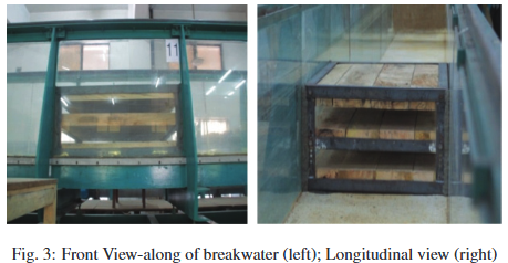Comparative study on hydrodynamic performance of porous and non-porous submerged breakwaterMd Sadiul Alam Chyon, Afeefa Rahman, and Md Ataur RahmanProcedia EngineeringThe paper offers a novel comparative case study on the performance of solid versus porous breakwater physically modeled under similar laboratory and wave conditions. Unidirectional waves were generated in a two dimensional laboratory flume having dimensions of 21.3 m length, 0.76 m width and 0.74 m height. Keeping still water depth of 50 cm, waves with T=1.6 sec, 1.7 sec, 1.8 sec and 2 sec were generated from a piston type wave generator. At 800 cm from the wave generator, horizontally slotted submerged breakwater of 100cm width,75cm length and 40 cm height were constructed with varying porosities of n=0.4, 0.5 and 0.6. Water level data were collected at six different locations for 12 unique run conditions. Using the measured data different hydrodynamic coefficients were calculated which include transmission co-efficient Kt, reflection co-efficient, Kr and wave energy loss co-efficient, KL. These co-efficient values were then, analyzed with respect to relative breakwater width (k.B), [where, k = wave number (2π/L), B = breakwater width] and porosity of breakwater. For the comparison, hydraulic performance of solid rectangular submerged breakwater of 40 cm height and 100 cm width was also reviewed which was modeled in the same laboratory under same wave condition of T=1.6,1.7 1.8 and 2.0 seconds and a still water depth of 50 cm. Experimental results from the porous breakwater and subsequent comparison of the results with solid breakwater indicate that, for transmitting less wave energy through the breakwater, maximum transmission co-efficient, Kt = 0.526 was obtained for porous breakwater with the lowest porosity (n=0.4) for T = 1.6 sec whereas for the solid breakwater maximum Kt= 0.5 was obtained for T=1.6 second. In terms of wave height, percentage wave height reduction was maximum 47% for porous breakwater whereas it was 68% for solid breakwater both at T=1.6 second. The hydrodynamic performance shows a significantly higher wave height reduction percentage for solid breakwater as anticipated by the physics of the interaction of the breakwater and the wave too. Besides, the position of wave breaking for different case scenario for both types of breakwater were recorded and analyzed which demonstrates that for porous breakwater waves tend to transmit through the slots and break at a certain distance beyond the breakwater whereas in case of solid breakwater, waves tend to break before or on the breakwater.