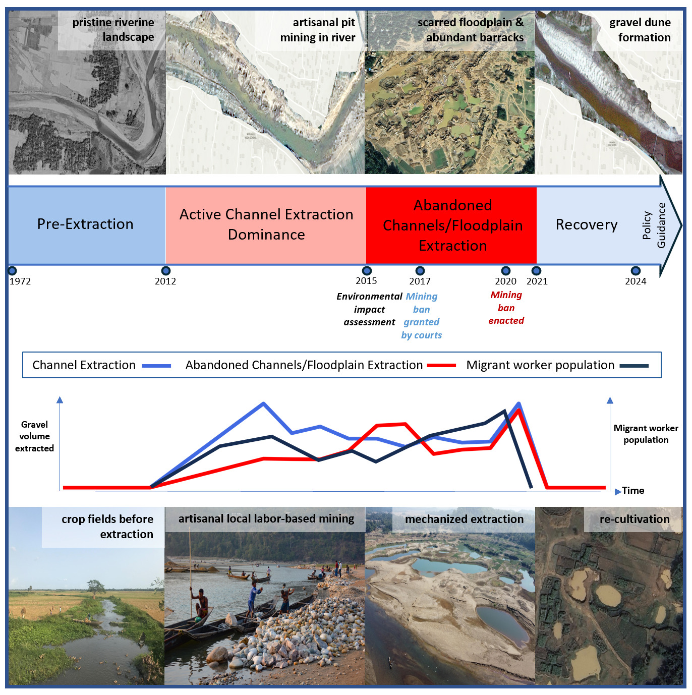 From extraction to recovery: Geomorphic and social transformations of gravel mining in the Lubhachorra River, Northeast BangladeshMd Sadiul Alam Chyon, Jim Best, and Shah Md Atiqul HaqCell Reports SustainabilityGravel and sand mining is widespread globally, generating both societal benefits and detrimental impacts on physical landscapes and local livelihoods. This study examines the impacts of gravel mining on physical and human landscapes in Northeast Bangladesh, focusing on changes during mining and after its cessation. We adopt a mixed-methods approach, integrating remote sensing analysis with interviews of local residents. Four periods of mining were identified, revealing faster recovery of the active channel than of abandoned channels and the floodplain. Channel morphodynamic response shows extraction sometimes exceeding natural sediment supply, underscoring the need for sustainable practices. Interviews with residents and an environmental pressure group reveal contrasting views, with residents reporting post-mining hardships. We propose six policy recommendations for sustainable sediment extraction in Bangladesh and comparable sites: supporting artisanal and small-scale mining, rotational extraction zones with monitoring, empowering community involvement, prioritizing extraction outside the active channel, and restoring abandoned channels and floodplain areas.